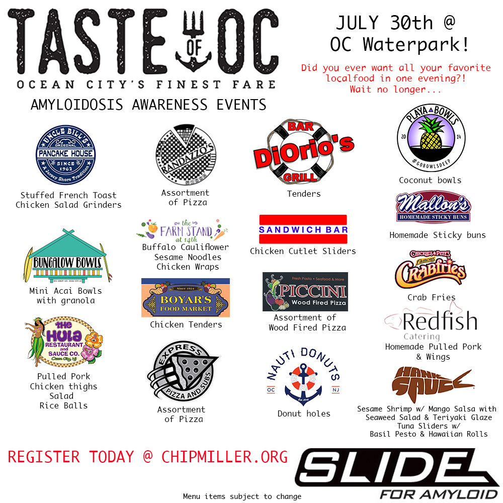 What is “Taste of OC”? It is an event within an event. The Slide for Amyloidosis will host some of Ocean City, NJ and the surrounding areas finest foods. Our team hand selected some of their favorite foods within the local area and put it all in one place for others to enjoy! Come out and support a wonderful cause at the Ocean City Water Park along with some amazing eats. NEW THIS YEAR – Red Fish Catering will be hosting our food donations this year. We are excited to have a professional Chef, Doug Vaules, helping us out.